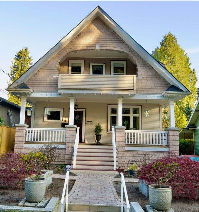 The exterior exhibits classic Craftsman-style characteristics, with the front door positioned on one side and a triple window and transom on the opposite side. The gabled roof features a broad overhang and sizable shed dormers extending from the sides. The façade combines rectangular, course-pattern shingles, and clapboard siding, complemented by an expansive front porch supported by four square columns.