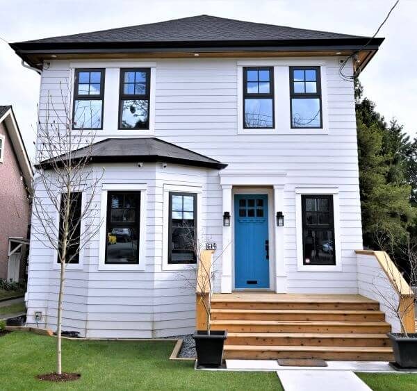 Exterior updates include removal of the original old-growth siding as it was so badly damaged by the weather and ivy plants. It was replaced with white Hardie shingles. The windows were replaced with energy efficient, triple paned black metal windows to give it a fresh, modern look. A new door was installed and painted in a bright turquoise to give the house a pop of colour.