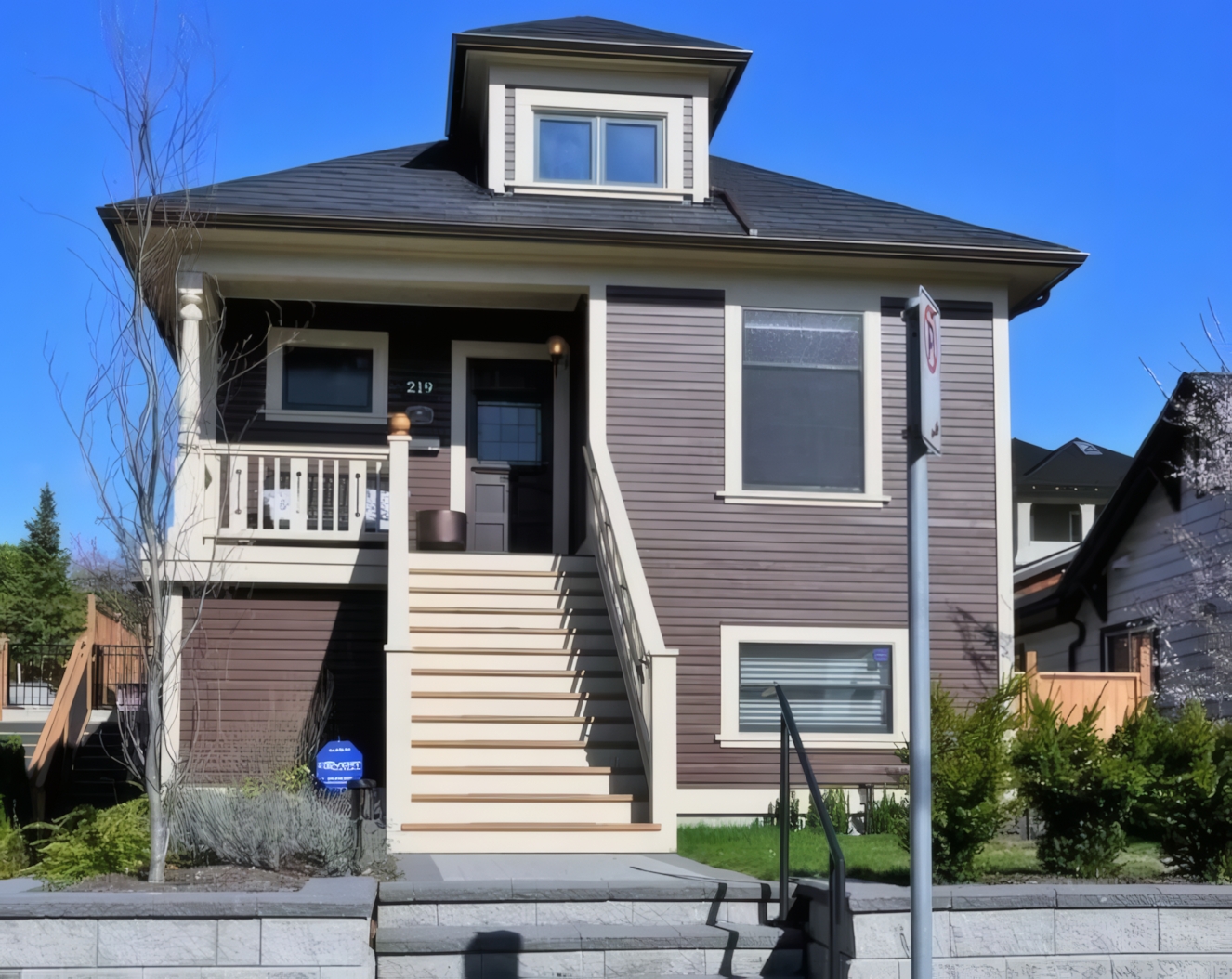 The vernacular Early Cottage design was a typical choice for working-class families in the Lower Mainland and was available in plan books popular at the time. The modest square-footage, hipped roof with front-facing dormer and porch below are illustrative of this architectural style. A single turned wood column on the front porch is a distinguishing feature of this home.
