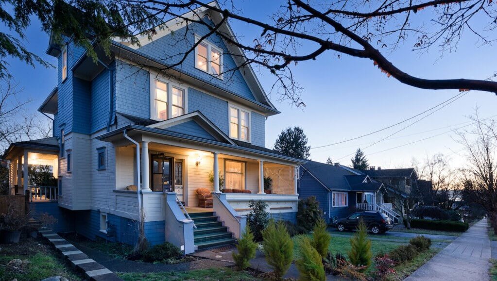 Commissioned by the McAdams in 1911, this nearly 4,000 sq ft, 2 1/2 storey gabled vernacular-style home features a front-gabled roof with roof skirt, and a full-width front porch with the front door off to the side, facing the stairs. Photo: 360hometours.ca