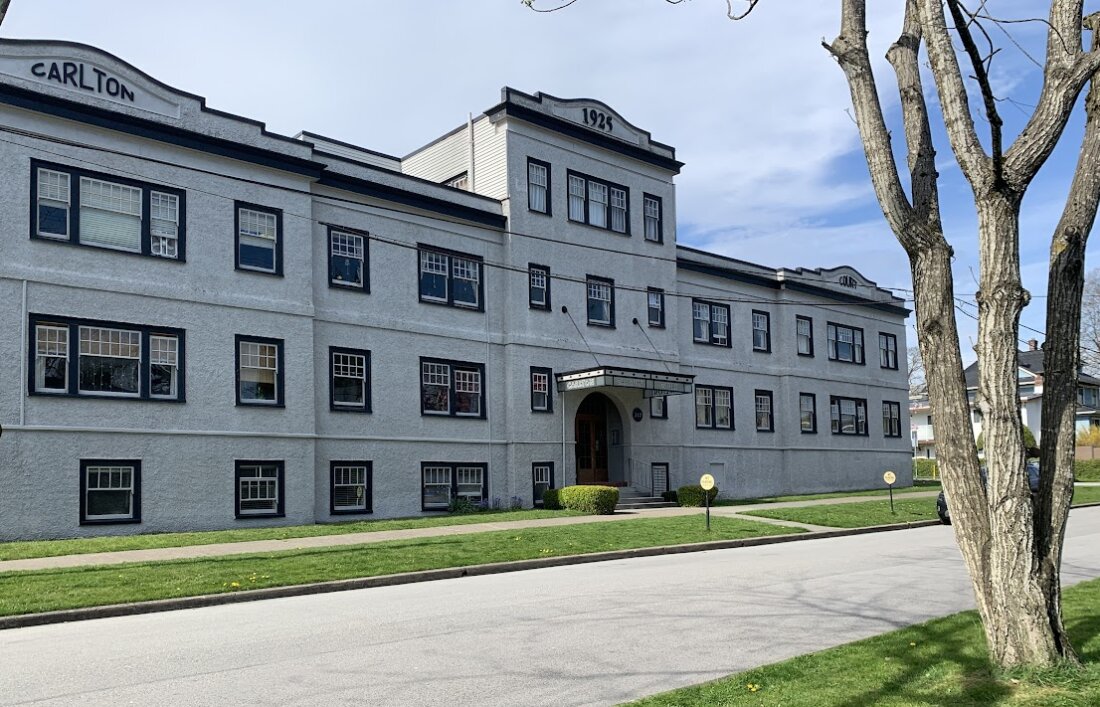 Built in 1925 for Westminster Apartments Ltd. and designed by architect Ralph Berrill, Carlton Court is a striking three-storey building in the Mission Revival style, known for its curved parapets, decorative details, and rear courtyard.