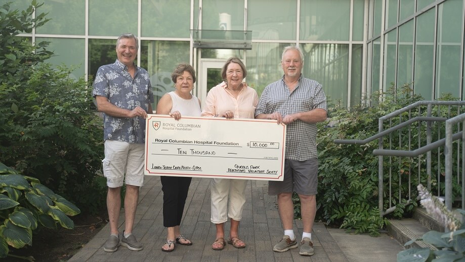 L–R: Doug Brun (Volunteer), Colleen McDonald (Executive Director), Jan Cook (Chair), and Ron Howe (Volunteer) present a cheque from the Queen's Park Healthcare Volunteer Society to the Royal Columbian Hospital Foundation, June 2025.